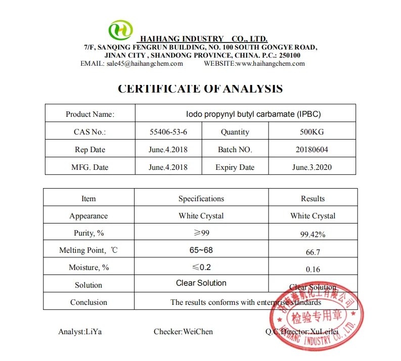 The COA of Iodo Propynyl buty carbamate(IPBC) CAS:55406-53-6 in bulk supply