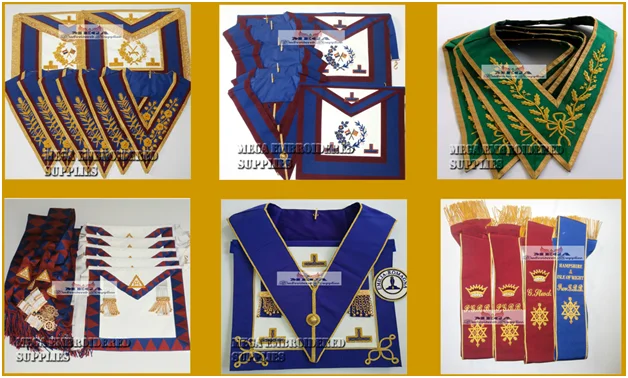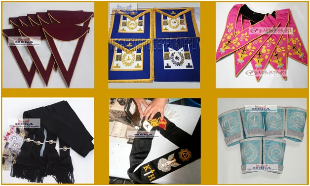 Aprons, Collars, Sashes, Cuff pairs, Badges, Soft cases, Hard carrying cases, embroidered Capes, cape covers, Jewels, Chain collars, Banners, Family Crest, Sword covers, duffel bags,