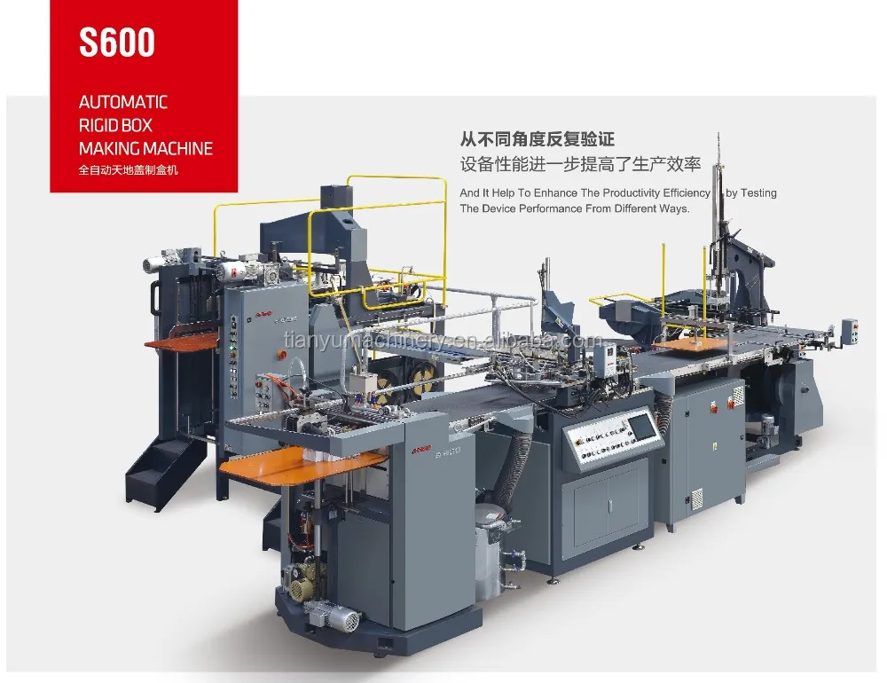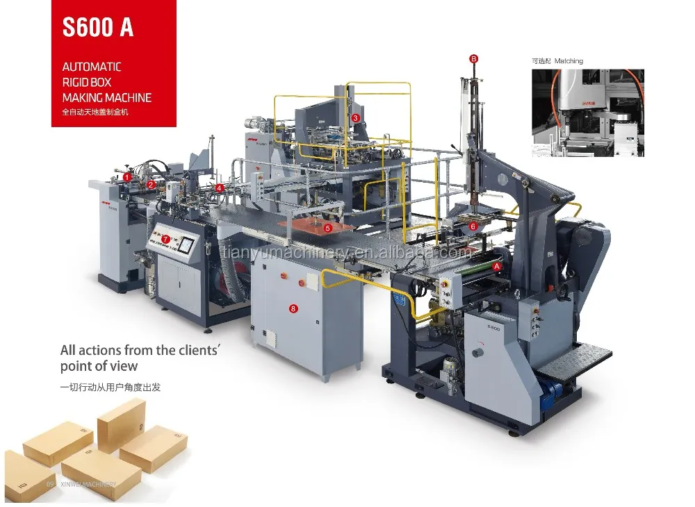 Xinwei S600 automatic rigid box making machine is the best equipment to make top grade rigid box, such as shoes box, shirt box, jewelry box, gift box and other luxurious paper boxes. It consists below 8 parts.