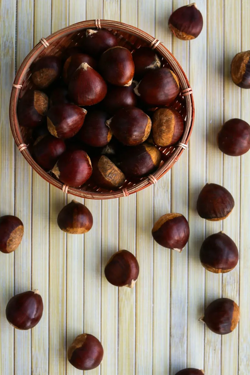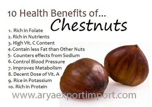 The chestnuts are a group of eight or nine species of deciduous trees and shrubs in the genus Castanea, in the beech family Fagaceae. They are native to temperate regions of the Northern Hemisphere. The name also refers to the edible nuts they produce.Nutrition in chestnuts. Chestnuts are probably not what we would call a nutrition powerhouse, but they are still pretty high in manganese, vitamin C, vitamin B6 and copper. They are in fact the only nuts that contain appreciable levels of vitamin C. In 100 grams of chestnuts you'll find 53 grams of carbohydrates.Chestnuts are the only nut the has Vitamin C and it is in a very high amount. ... Chestnuts contain fiber which absorbs water and makes stool softer along with adding bulk. The softer and bulkier stool will pass through the gastrointestinal tract faster and easier.Eat your raw chestnut. Depending on where your chestnut originated, it may or may not be safe to eat raw. American chestnuts have high concentrations of tannic acid and will make you ill if you eat them raw. ... Because of the dangers of eating raw chestnuts, they are rarely used in recipes without first being cooked.Whole chestnuts can be eaten raw, baked, boiled or roasted. Use a sharp knife or chestnut knife to peel and eat them raw, or score an X with the knife deep through the outer shell, then roast at 400 degrees for 10 minutes or until the cut edges peel back.Chestnuts can be a nutritious and delicious fall and winter treat. ... An edible chestnut is easiest to spot if it is still in its husk, which is spiny and needle-sharp. The toxic, inedible chestnut, also called the horse chestnut, has a husk that is much smoother, with only a few warts.The ideal storage conditions for chestnuts are 33-35 degrees Fahrenheit and 85-90% humidity. We recommend storing chestnuts in covered containers in the coldest part of the refrigerator. Stored properly in the refrigerator, chestnuts can have a shelf life of approximately 2-3 weeks.In 100 grams of chestnuts you'll find 53 grams of carbohydrates. Of those 53 grams, 11 come from simple sugars, 5 from fiber and the remaining 37 grams is starch. In those same 100 grams of chestnuts, you'll only get 2.2 grams of fat and 3 grams of protein.Once the water begins to simmer, remove the chestnuts from the water using a mesh strainer or slotted spoon and transfer them to a baking sheet. Roast for 15 minutes, or until the shells begin to peel back where you cut into them. ... Both the outer shell and the tough brown skin around the chestnuts should be peeled off.Put the chestnuts in a large bowl and add enough water to cover by 1 inch. Let soak for at least 30 minutes and up to 1 hour. ... Spread the chestnuts in a roasting pan and roast in a preheated 400°F oven for 15 to 20 minutes, or until the shells are brittle and have curled back somewhat at the X.Heat the oven to 200C/400F/Gas 6. Using a small, sharp knife, cut a cross into the skin of each nut. Put in a roasting tin and bake until the skins open and the insides are tender, about 30 minutes. Serve in paper bags, if you like.Similar to chestnuts, they are also high in manganese and copper but with lower amounts of potassium, vitamin C and vitamin B6. Meanwhile, almonds are loaded with vitamin E and protein and contain a good amount of manganese, magnesium and riboflavin.