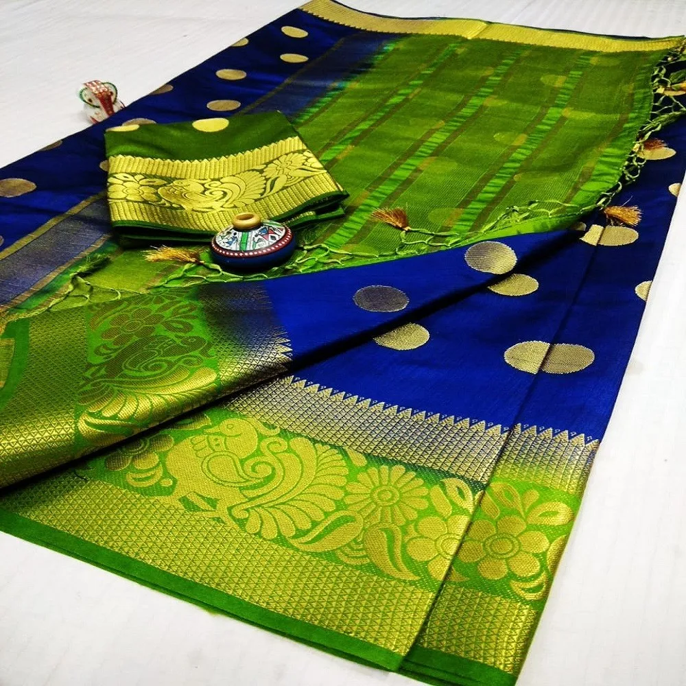 PURE TUSSAR SILK SAREE WITH CHIT PALLU AND ALL OVER BUTTI IN SAREE WITH RUNNING BLOUSE WITH CONTRAST
