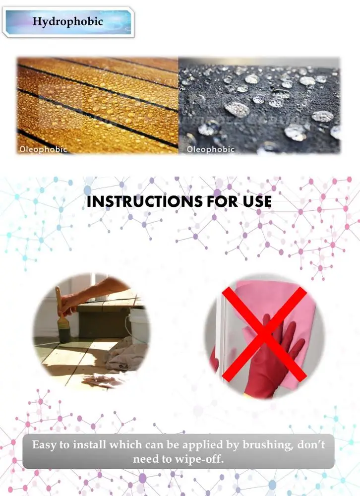 Stone/Ceramic/Wood Coating is a clear liquid, ready to use, real surface coating able to resist water and dirt. By using the Nanotechnology, Stone/Ceramic/Wood Coating createsa good barrier by chemically binding to the substrate, which is Provides an easy to clean ability to avoid the water, dirt, grease and other stains. The protected material can be cleaned numerous times without reapplication. Nano Lacquer is resistant to solvents, acids, bases and chemicals. Stone/Ceramic/Wood Coating is applied as one component coating. No mixing with another material is required. Only a thin film of Stone/Ceramic/Wood Coating is needed to provide best surface solution protection. Dry to touch will be accomplished within 1 hourat room temperature. Full curing is accomplished at room temperature after applying for 1 day.