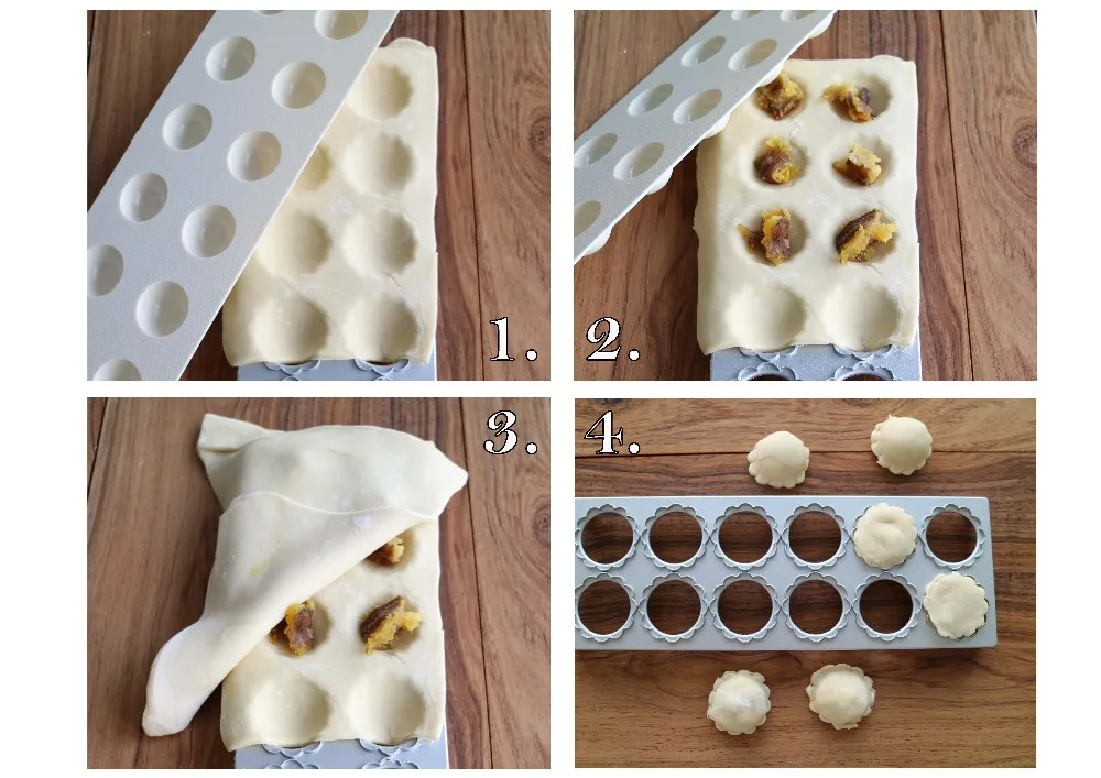 1. Lay a sheet of dough over the metal "cut and seal" plate.