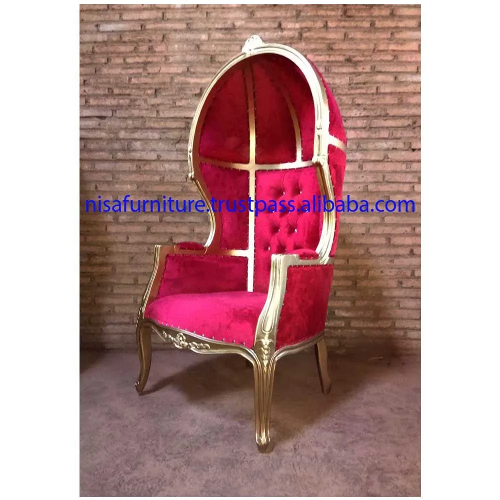 Gold Red Velvet Wedding French canopy chair hood for party rental is carefully carving frame is made of wood. It is upholstered with high quality leather and finished with decorative quilting on the back. Elegant design for living room, bedroom, and more.