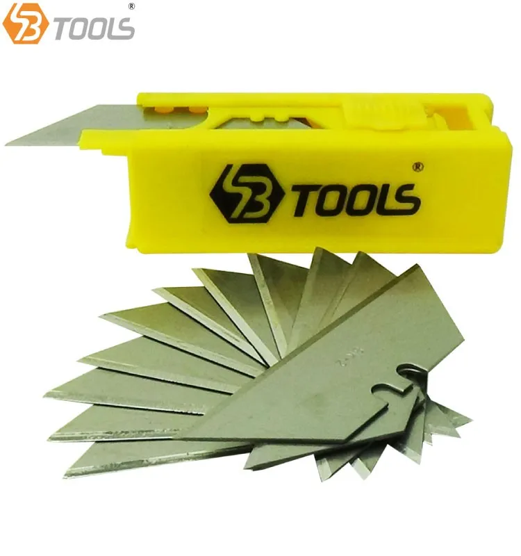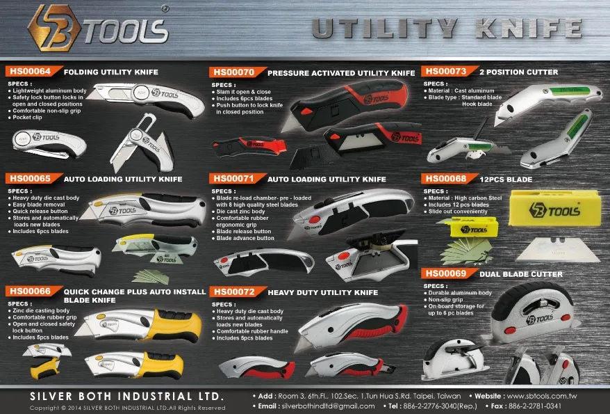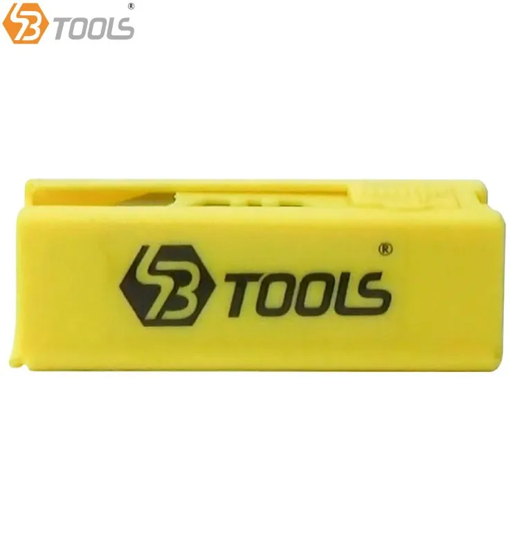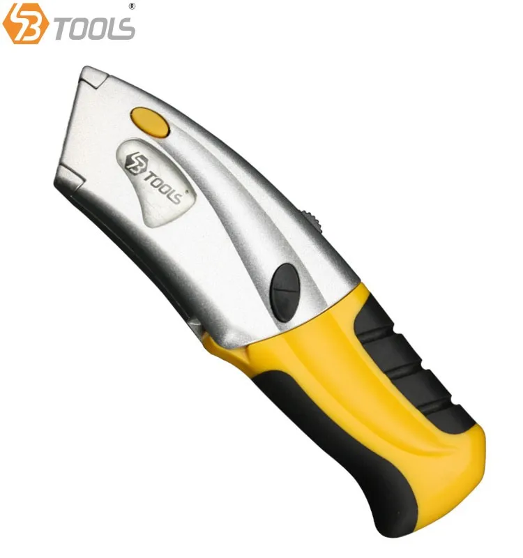 SBTools Quick Change Auto Loading Utility Knife is made with heavy duty metal shell and rubber handle with stream line design which fit comfortably in hand. Simply hold and press the top black switch forward/backward to use this knife.