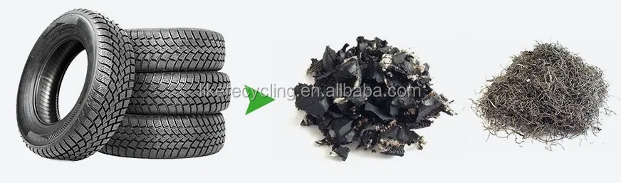 Each step, you will get different size of rubber as your requirement. such as 50-150mm rubber blocks, 10-30mm wire-free rubber mulch, 1-5mm rubber granule, 30-120mesh rubber powder.