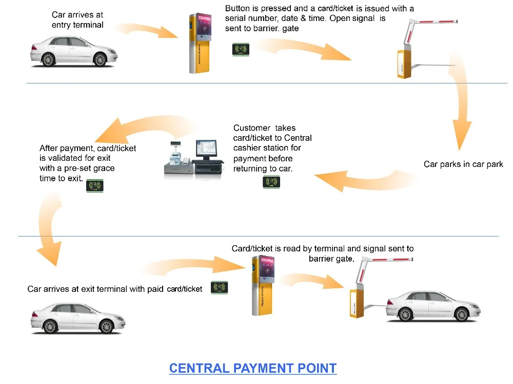 Exit Equipment : 1. Parking barrier gate 2. Entry control machine (RFID card dispenser) 3. Loop detector | Exit Equipment : 1. Parking barrier gate 2. Exit control machine (RFID card reader) 3. Loop detector | |