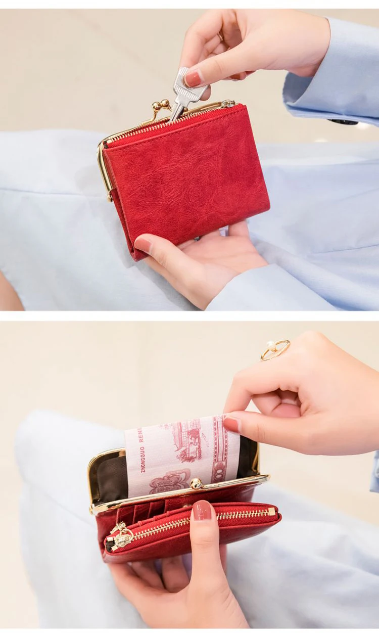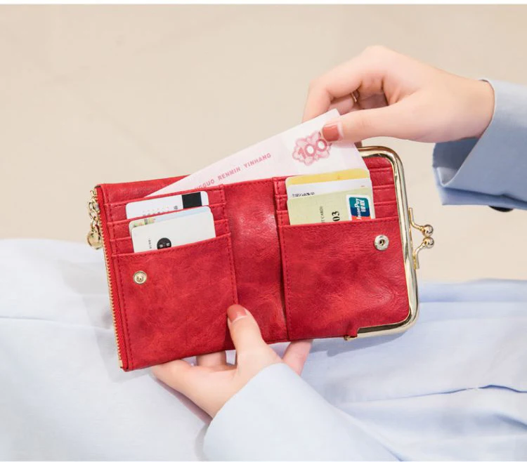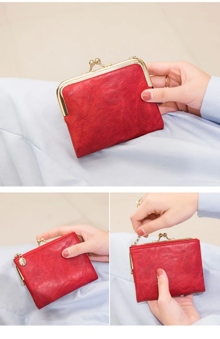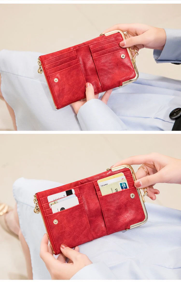 New PU Leather Card Holder Short Folding Wallet With Metal Clip Frame Change Pocket Women Coin Purse