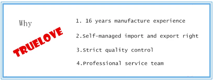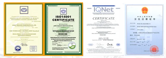 TRUELOVE FOODSTUFF CO., LTD has passed ISO9001 quality management system, ISO14001 environment system, OHSAS18001 1999 occupational health and safety management system and QS national safe food quality system.