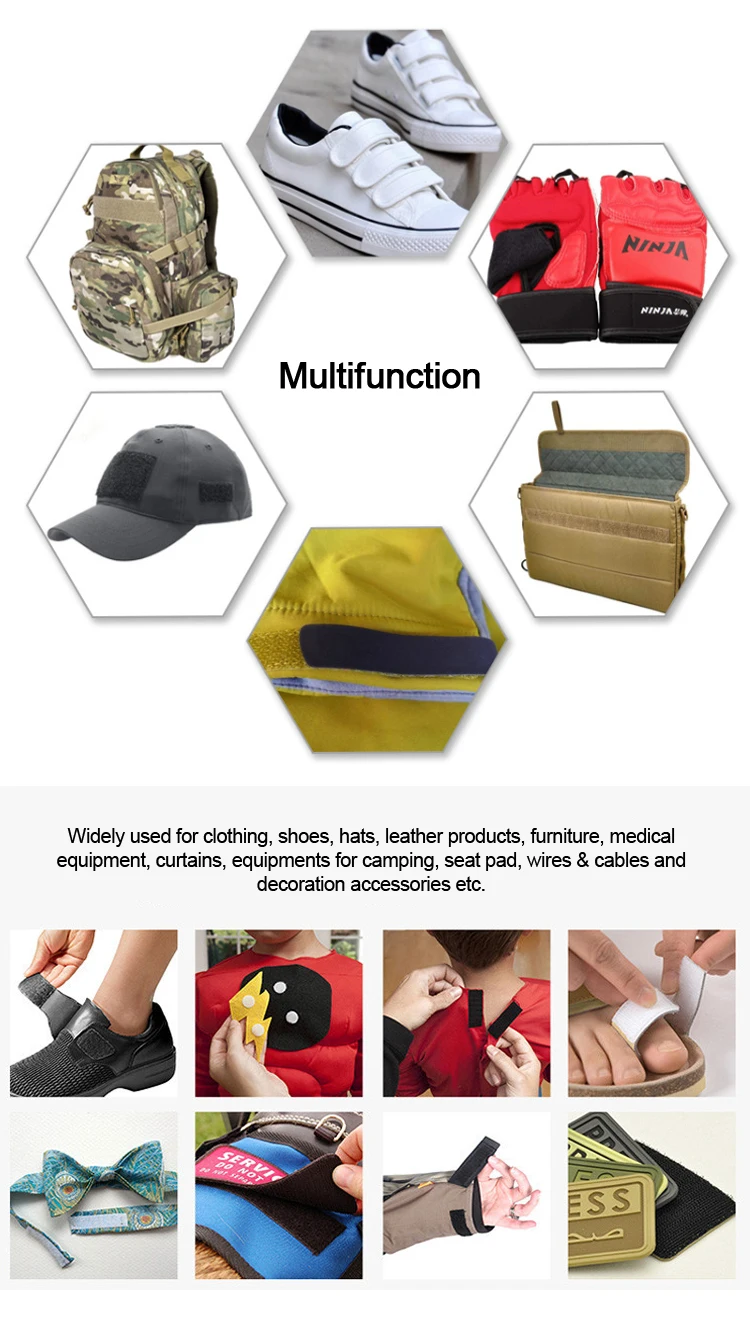 Application | 1) Used for clothing, shoes, hats, leather products, furniture, medical equipment, curtains, equipments for camping, seat pad, wires & cables and decoration accessories etc. 2) Suitable for: Affixing propaganda materials, displaying in exhibitions, positioning of office supplies, household commodities, cushions, car seats, etc. Easy fastening and removing; Fastening for table cloth, chair cover etc. It can be reused. |