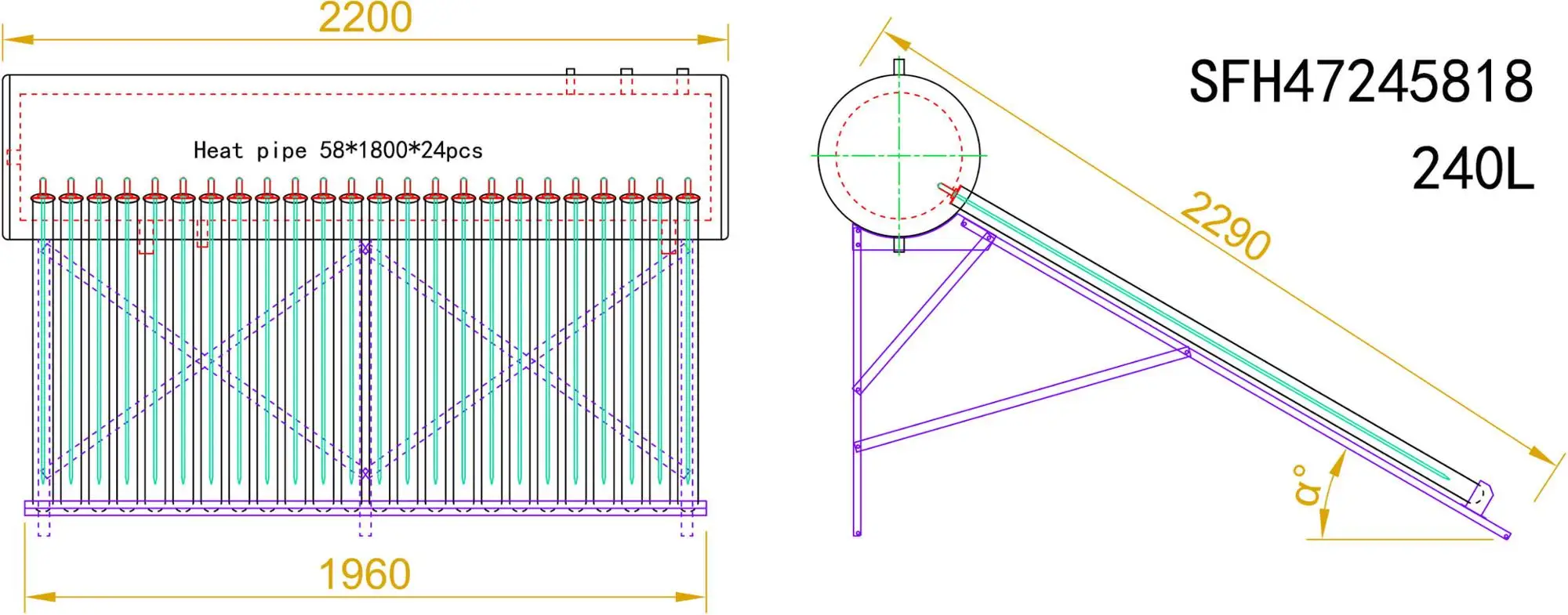 The SFH250 is a pressurized solar water heater that utilizes the high absorption ratio and low emissivity of the solar vacuum collector tube to convert the absorbed solar radiant energy into heat energy, which is inserted into the vacuum tube. The phase change heat transfer of the superconducting heat pipe quickly transfers heat energy into the water tank, gradually increasing the temperature of the entire water tank. The solar vacuum collector tube has the ability to naturally track the sunlight. As long as there is solar auxiliary radiation, the vacuum tube can collect heat immediately; because the phase change superconducting tube has one-way heat transfer characteristics, even in the alpine region, it can run efficiently all the year round.