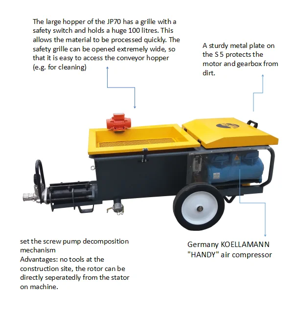 **The modular system of the JP70 is based on a worm pump with a powerful 5.5 kW drive.The basic version is particularly suitable for users who pump and spray pumpable wet mortars with grain sizes of up to 6 mm.