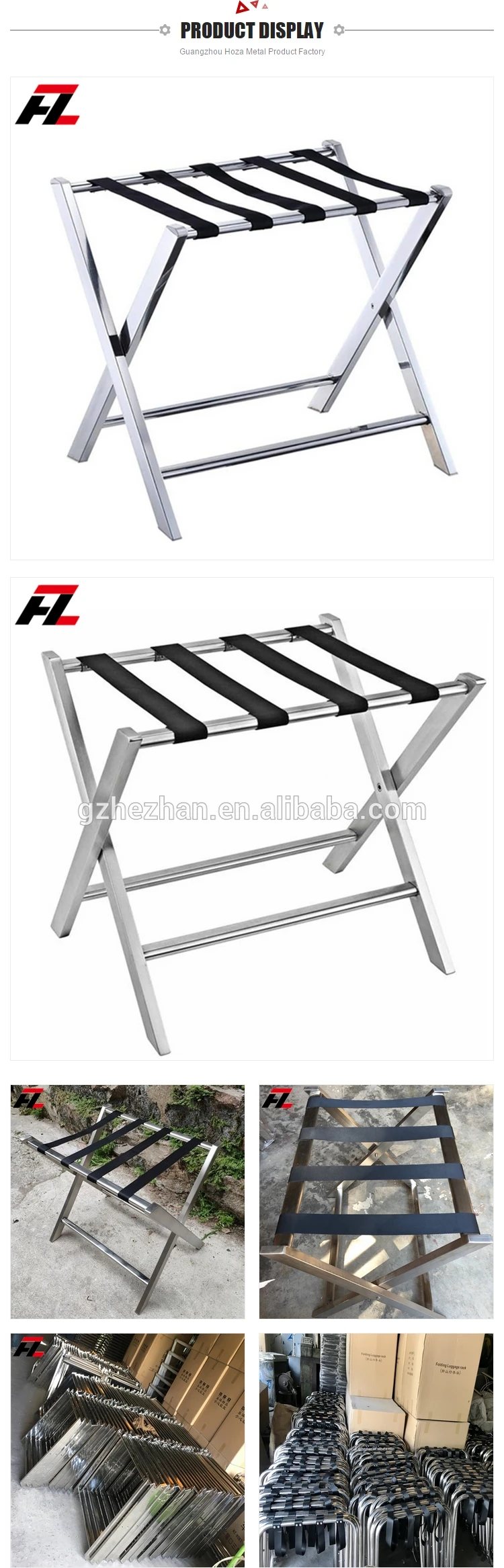 Guangzhou Hoza Metal Product Factory Guangzhou Huangze Hotel Article Co.,Ltd. Hoza was established in 1984, has been a dedicated stainless-steel manufacturer for over 30 years. The corporate philosophy is always hews to high-quality, sincerity and complete services. Such has turned HZ into a well-known industry in Guangzhou. Hoza holds 3 production workshop . One is aims at outputting stainless-steel products, including luggage rack ,umbrella stands, ashtrays, and display stands and so on . The order one is mainly responsible for churning out relatively large-sized items, such as trash bins, work tables, utility carts etc.Third workshop is focus on doing the wood item such us baby cot wooden bin ,podium and so on HOZA has always endeavored for perfection by purchasing the most advanced equipment and by keeping a highly skilled and experienced workforce, with one definite goal-to achieve the possible highest quality. In addition, HOZA provides OEM and ODM services to meet customer''s needs. For years, HOZA has been exporting its products to other countries, winning international trust and support.