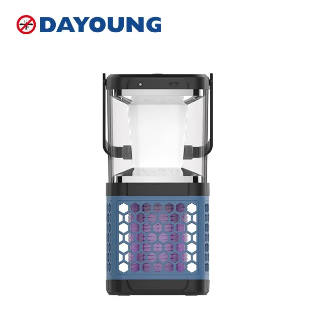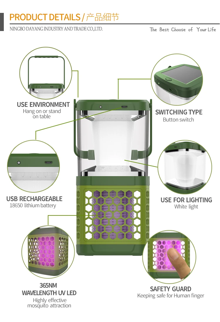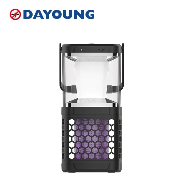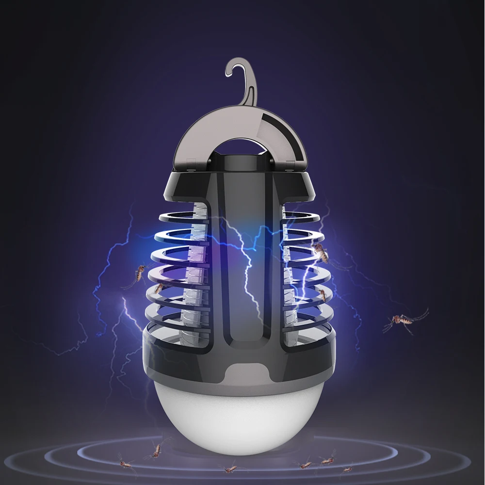 The camping mosquito killer lamp is with both function of lighting and mosquito killing. It's a portable type with a hanging tag. Easy to place it on the table or hang it. It can be charged by solar panel or USB cable. You can charge it in your car even.