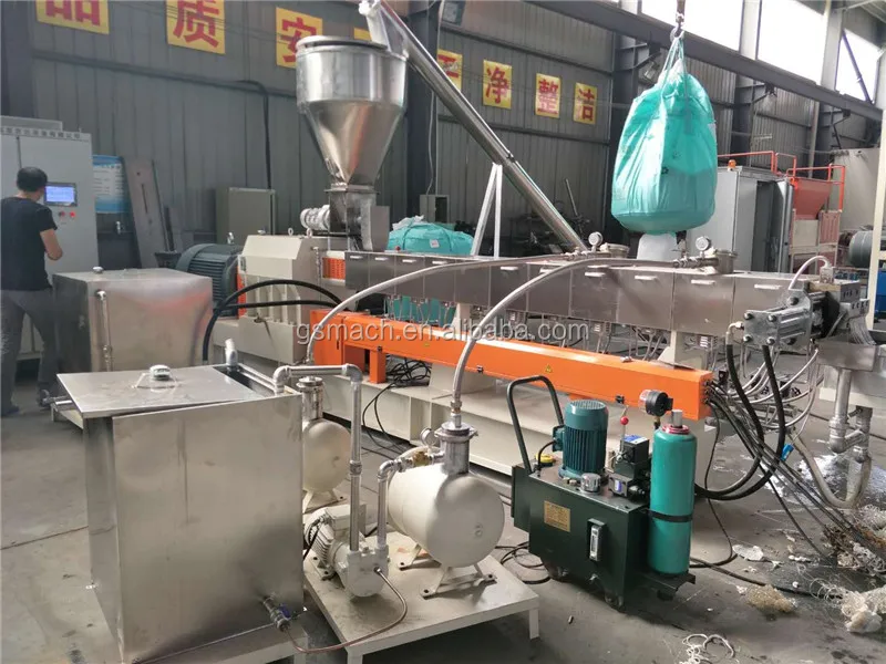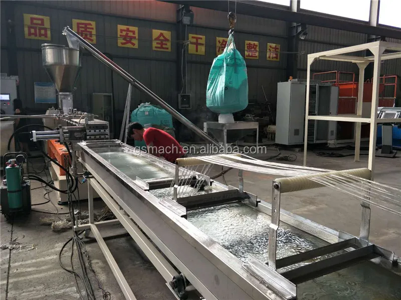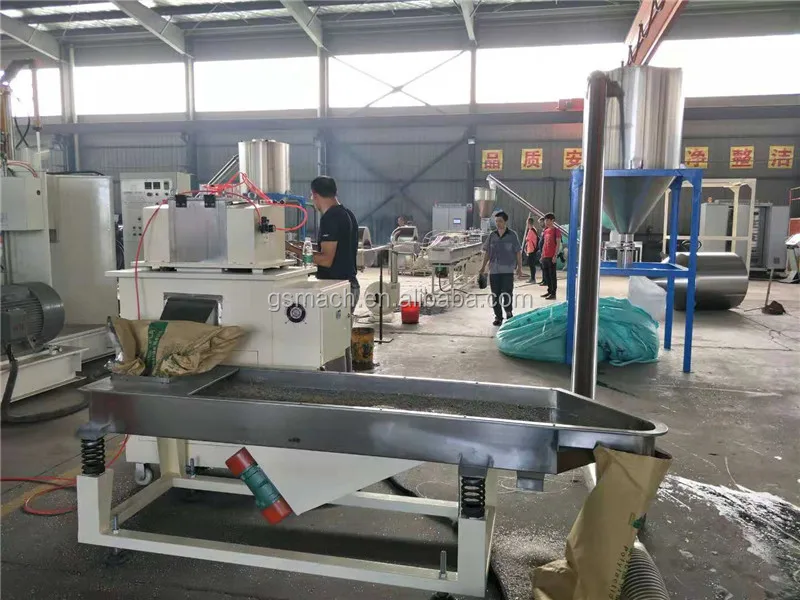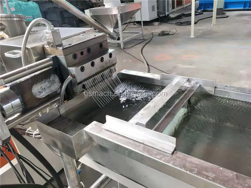 coming our from twin screw extruder---Dried by dryer---Cut into PET granules by pelletizer.