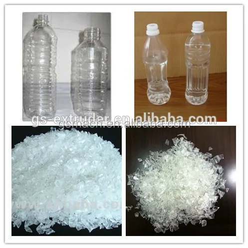 Crushed PET bottle (PET bottle flakes)---Processed in twin screw extruder---Cooled in water tank after