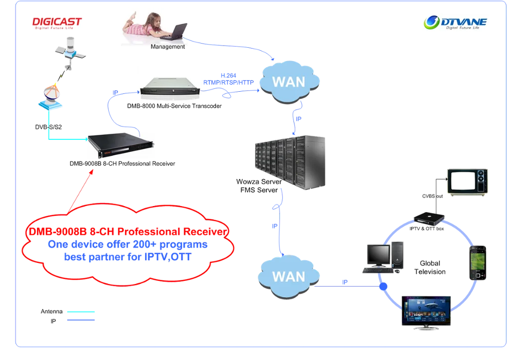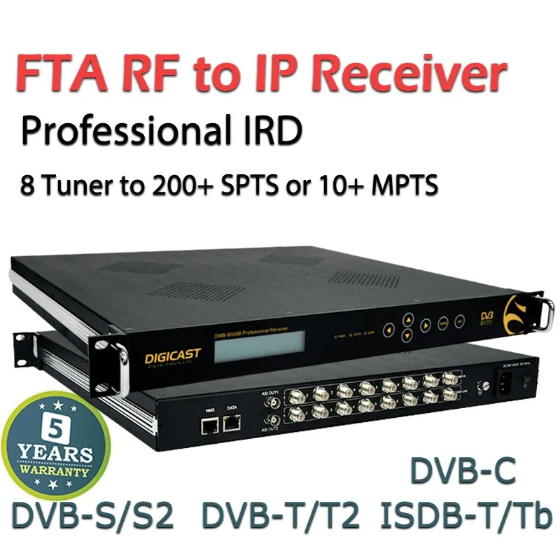 DMB-9008B 8-Channel professional Full HD Satellite receiver works with TS over IP technology. De-modulate the Tuner signals to DVBASI signals, encapsulating TS over IP signals transmission. Meanwhile capable of multiplexing, SimulCryption, DVBCSA scrambling, BISS decryption. This Multichannel Professional Receiver can accept 8*Tuner(DVBS/S2/C/) input signals, demodulate to 2*ASI(independent) output and encapsulate to IP packet, then output 246*SPTS or 14*MPTS over IP addresses or ports. Adopting Gigabit Ethernet interface, DMB9008B 8 Channel Professional IPTV Receiver features high I/O bit rate, powerful correction capability, low error rate, etc.. It has become the bridge between the new generation IP network and traditional DVB network, which is suitable for digital TV , IPTV & OTT headend contribution system.