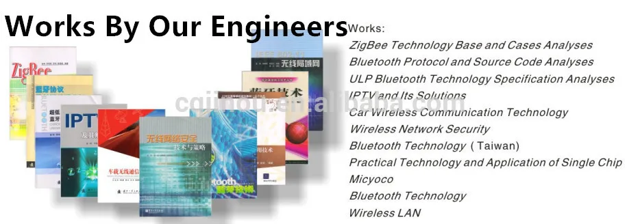 Our engineers has published more than 10 works in Bluetooth technology , such as Bluetooth Technology, Bluetooth Protocol and Source Code Analysis, Wireless Local Area Network, Wireless Network Security, IPTV and Its Solution, Zigbee Technology and Cases Analyses, ULP Bluetooth Technology Specification Analyses, etc.. In addition, they also present more than 80 Disquisitions and more than 60 patents.