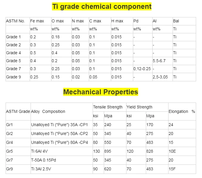 Grade 1: Pure Titanium, relatively low strength and high ductility. Grade 2:The pure titanium most used. The best combination of strength,ductility and weldability. Grade 5:The most manufactured titanium alloy. Exceedingly high strength. high heat resistance. Grade 9: Very high strength and corrosion resistance.