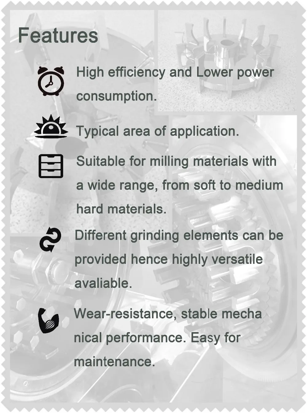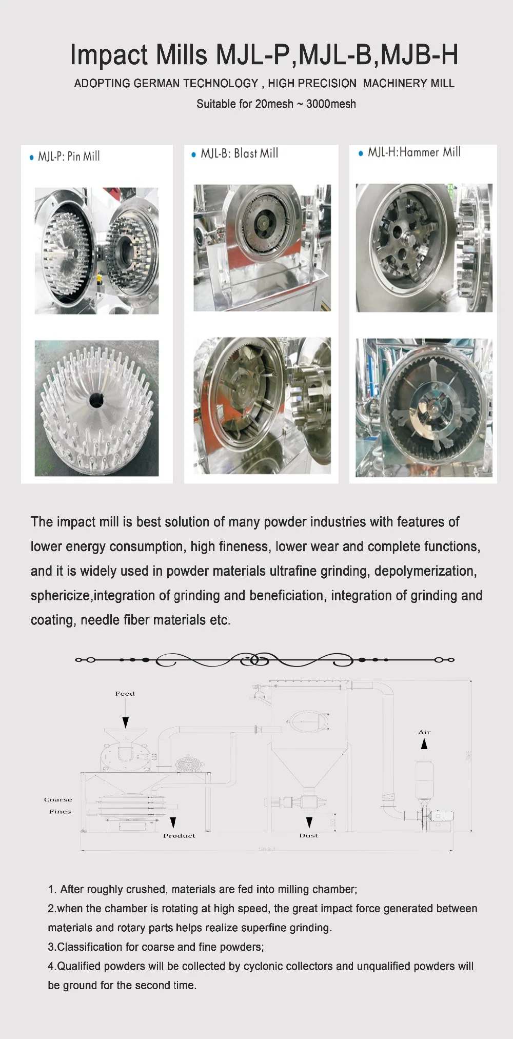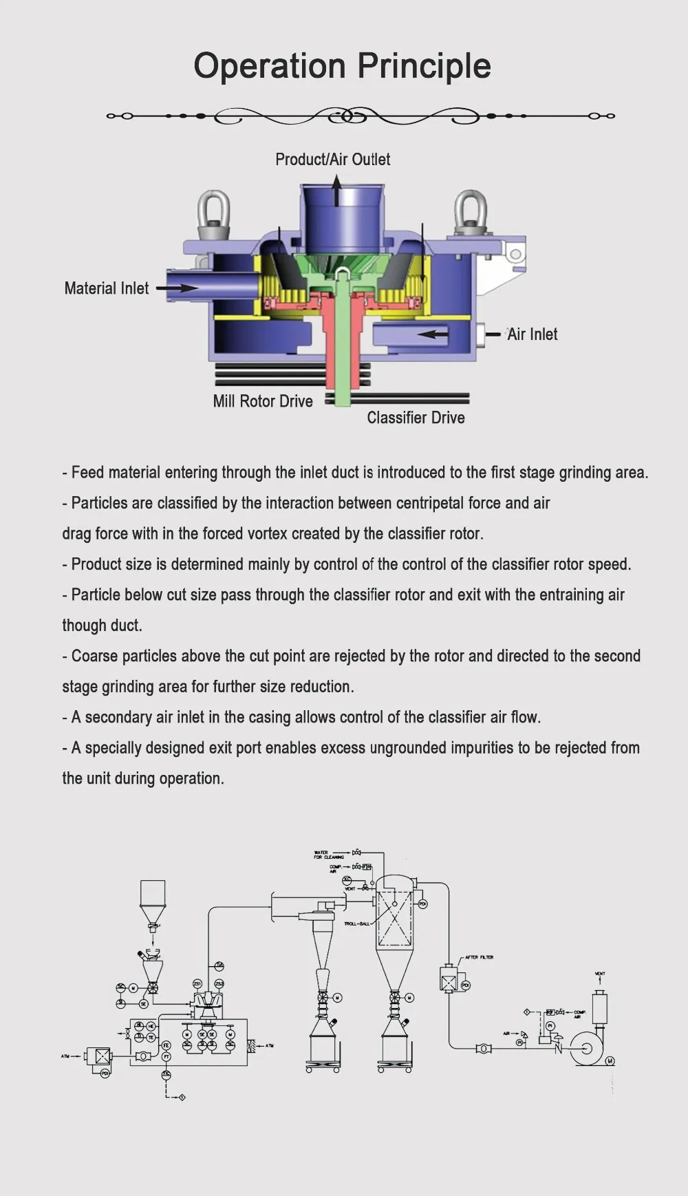 The impact mill can integrated with an integral air classifier, which can be called air classifier mill. The air classifier mill demand lower energy consumption and can give much higher production efficiency.