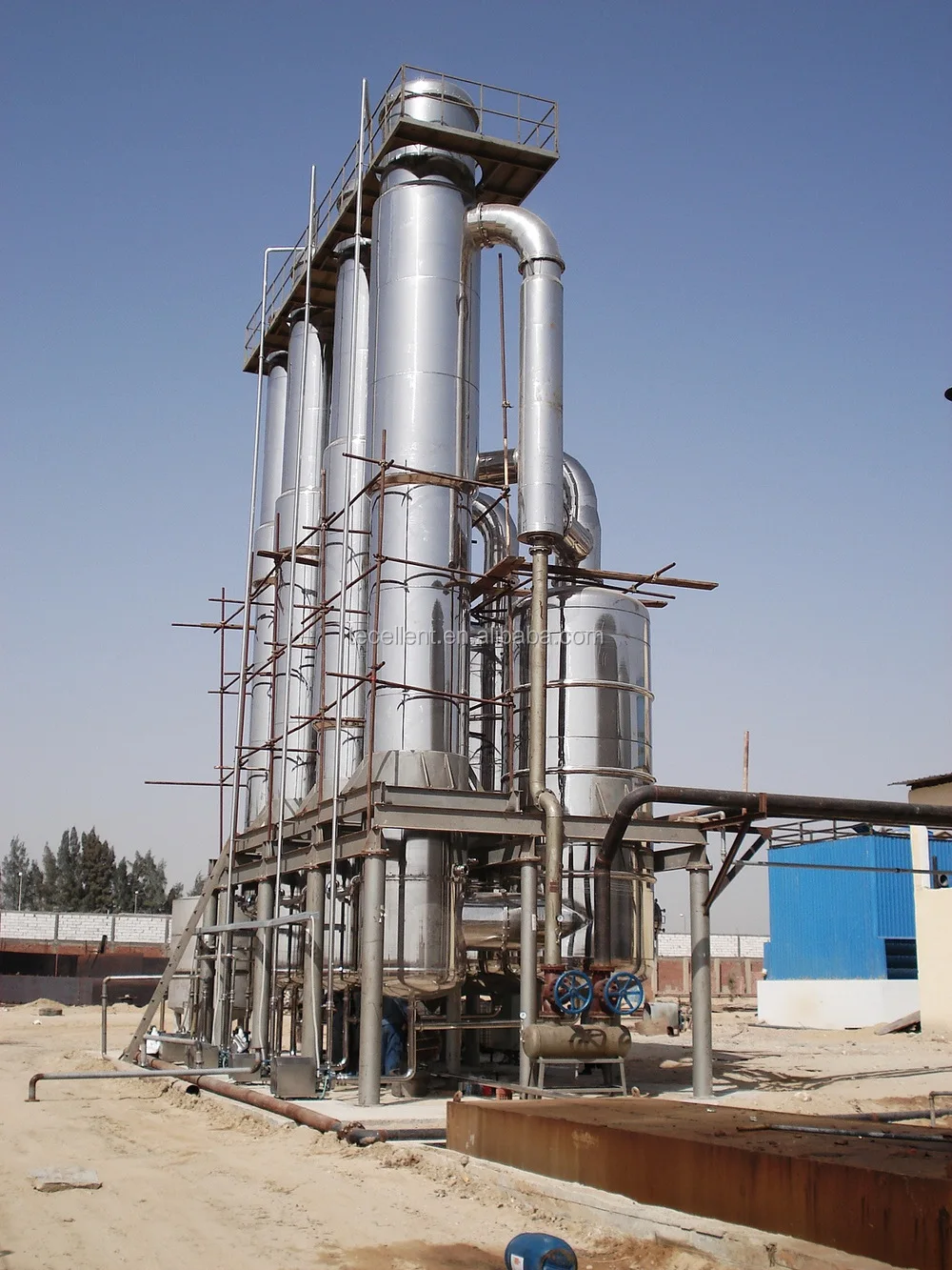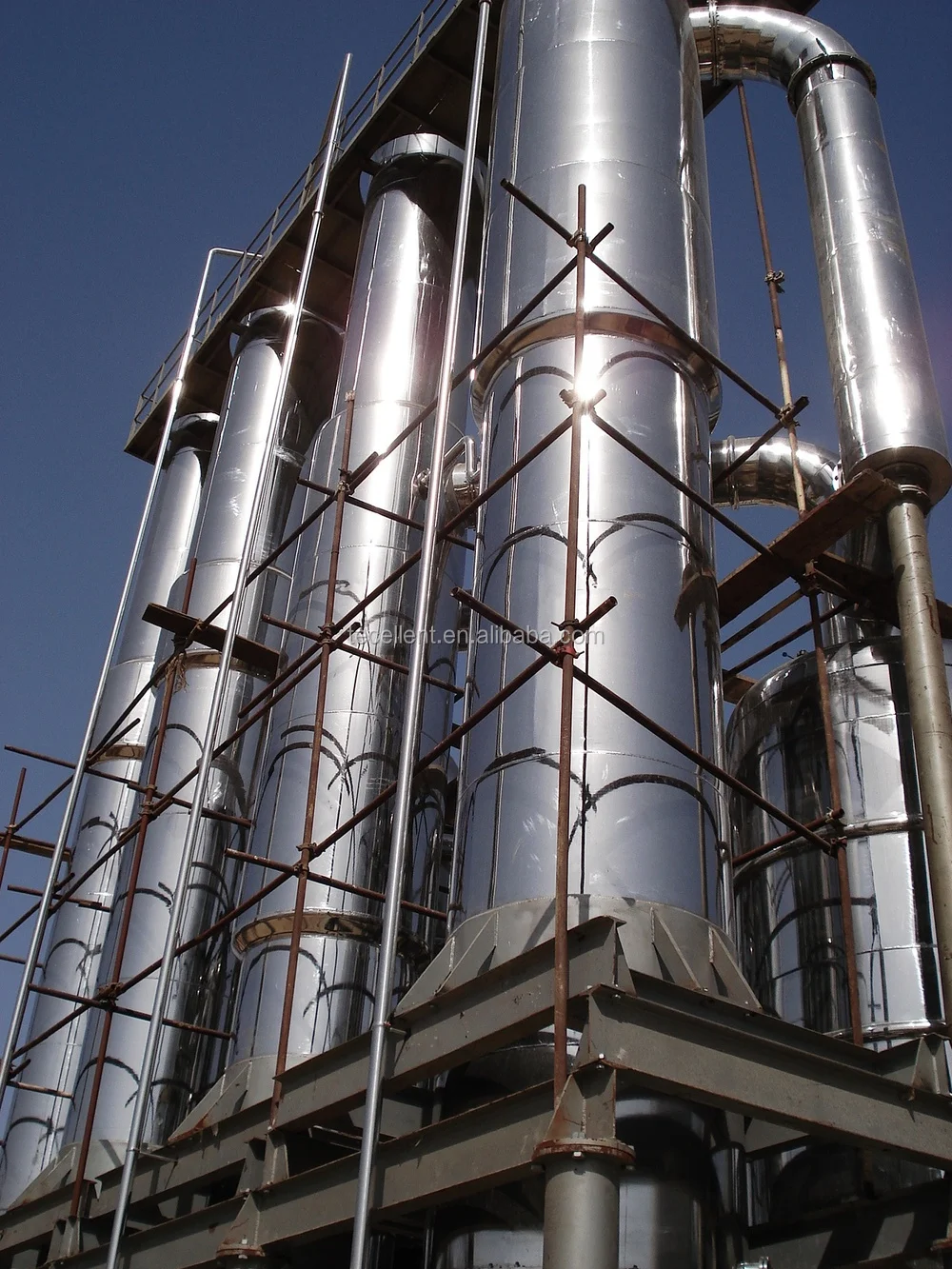 Multi-effect Thin Film Concentrator is composed of Effect I/ Effect II/ Effect III Heaters, Effect I/ Effect II/ Effect III/ separator, Condenser, Thermal Compression pump, Vacuum system, Charging Pump, Effect I/ Effect II Material Transfer pump, Dicharging Pump, condensate water pump, Operation Platform, Electrical control cabinet and pipeline etc