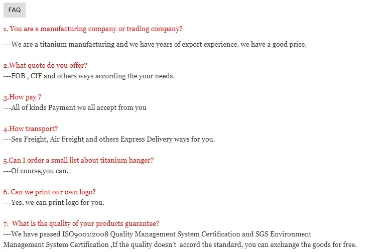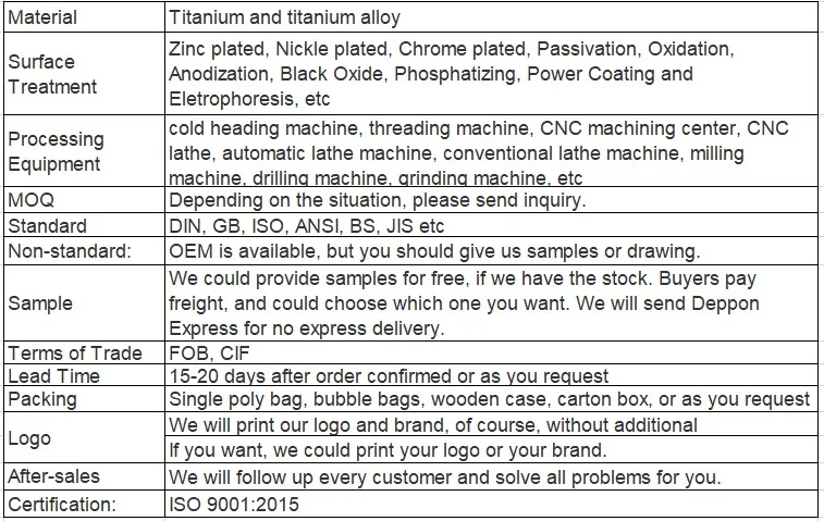 marine engineering, sports, and other fields. Our product specification adopts international standards such as GB, ASME, DIN, JIS and other advanced standards of the industry. Tons of titanium products are in stock. Our workshop and finished product warehouses cover an area of more than 2,000 square meters and a variety of equipment, such as precision forging machine, centerless lathe,cylindrical grinder, etc. are imported from the USA, Germany and other countries.Our company has the R&D department, production department, marketing department, quality inspection department, human resources department, etc. There are two senior researchers, dozens of professional and technical personnel, more than thirty skilled production workers and eight professional foreign trade members in those departments.Relying on the strong comprehensive strength for efficient resource sharing of "Titanium Valley of China" and unique geographical, material and scientific research advantages, our company can provide you with high quality products. Our company has passed ISO9001:2000 Quality Management System Certification and SGS Environment Management System Certification. We will adhere to the principle of our production and management purposes, and always maintain the quality of material, the product precision, the pursuit of the user's value and support of the quality. All staff and colleagues of our company make progress together for the prosperity of China's nonferrous metals. Sincerely welcome friends from all walks of lifeto visit, communicate, negotiate and cooperate.