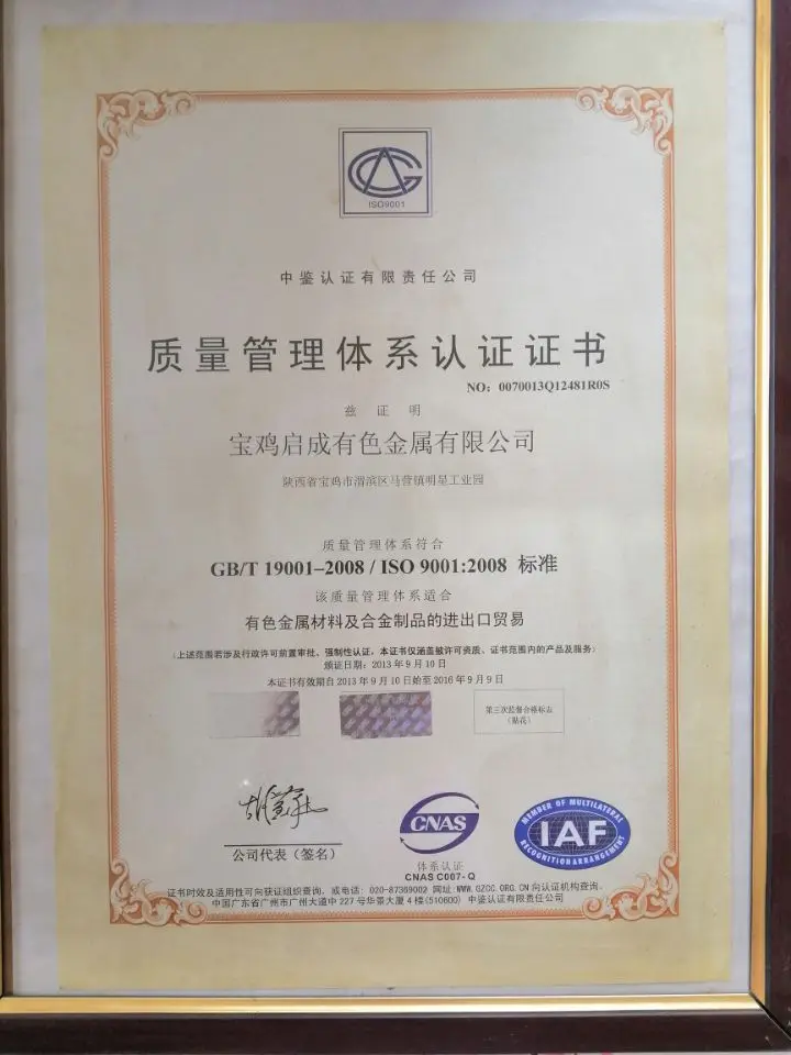 Baoji Qicheng Non-Ferrous Metals Co., Ltd. is located in the industrial heartland, Baoji, Shaanxi Province of China. Our company is a comprehensive enterprise specialized in the research and development, production and sales of titanium and titanium alloy,refractory, rare and other non-ferrous metal materials.Our company mainly exports all kinds of titanium sheets, titanium rods,titanium wires, titanium pipes, titanium rings, titanium flanges, titanium filters, filter plates and titanium processing parts.
