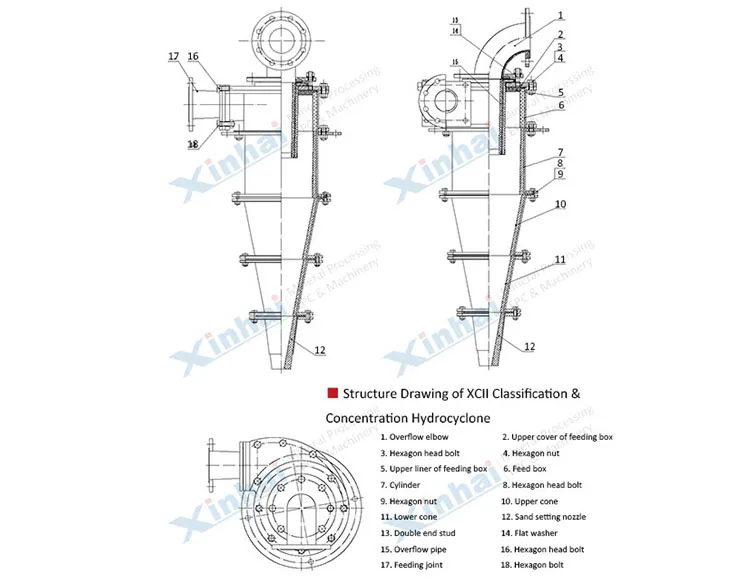 Model | Spec. | Processing Capacity (m3/h) | Partition Size (μm) | Diameter of Overflow Port (mm) | Diameter of Dust- Setting Nozzle (mm) | Inlet Pressure (MPa) |