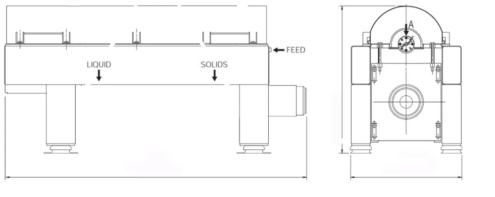 The bowl is driven at the conical end by an electric motor and V-belt transmission. Bowl, conveyor, casing, inlet tube, outlets and other parts in contact with the process media are made from stainless steel AISI 316.