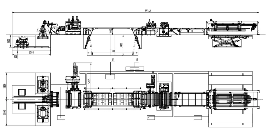 1. Loading coil car 2. Decoiler 3. Subber roller 4. Pinch/leveler 5. Loop pit and bridge 6. Leveler/pinch 7. NC length 8. Cross shear 9. Conveyor belt 10. Stacking device 11. Lifting table car 12. Hydraulic/pneumatic/lubrication system 13. Electrical cabinet |