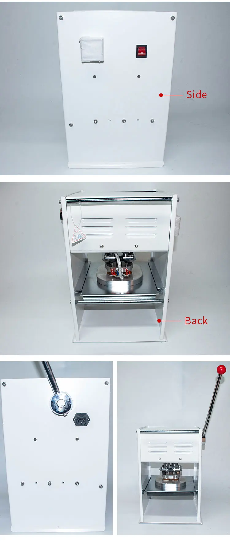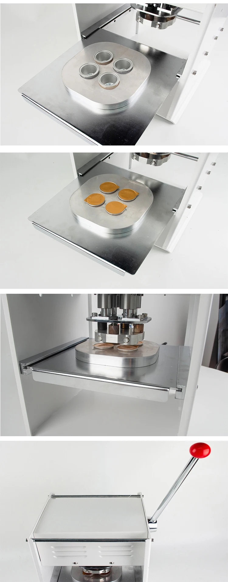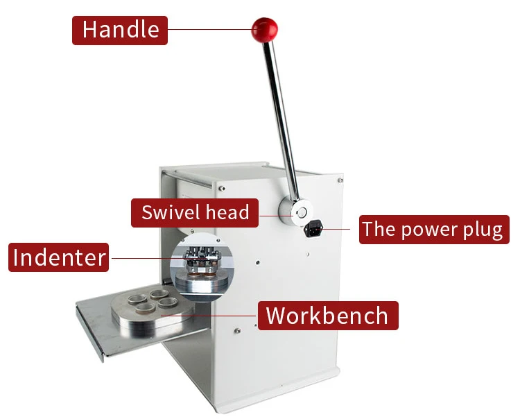 Specifications: 1. can roll the film automatically; 2. the normal cup diameter is75mm and 95mm; 3. beautiful shape and good looking; 4. high quality and good after-service; 5. the cup diameter can be customized as customers' requirement; 6.Sealing machine adopts stainless steel, aluminum alloy, steel and other corrosion protection materials, conform to food hygiene.It is suitable for sealing a variety of materials: PP / PE / paper and easy to tear the film.Sealing machine performance is stable, reliable, convenient. It is ideal for high production line main equipment.Semi-automatic sealing machine, small size, light weight.