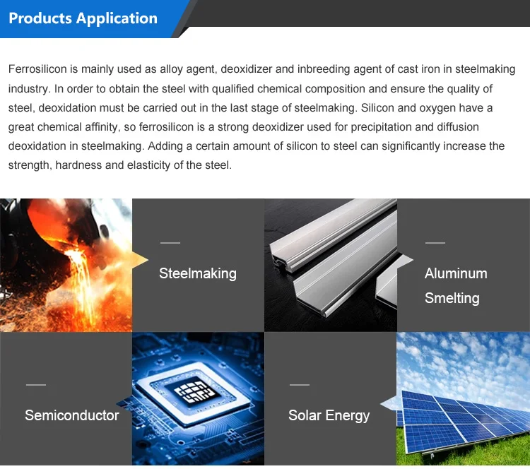 2.Ferro silicon also can be used as alloy elements join agent,which is widely used in low alloy steel,non-ferrous metal,bearing steel,heat-resistant steels and electrician silicon steel.