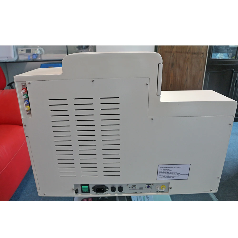 Testing Method: Low pressure ion exchange liquid chromatography Testing Item: Glycated hemoglobin HbA1c Testing Time: 3 minutes (reporting), Full-processing 4.5 minutes (including cleaning column and recovery time) Testing Parameters: Precision (CV) ≤3%, Accuracy(V) ≤1.50% Testing Scope: 3.0%-18.0% Sample Type: Whole blood, dilute blood Sample Volume: 5-10ul Photometer: 415nm LED Integral flow colorimeter Calibration: Optional selection of 2 points calibration, optional selection automation, Equipped with 2 groups of high and low level calibrators. Reagent allocation: Each standard package includes A, B, C, D eluent, calibrator, and hemolytic agent, pump tubing Display: 320×240 LC Graphic display, displaying real-time testing curve Printer: 58nm Thermal printer, printing testing curve and report Panel : 0-9, YES, NO, START, STOP, ST, PRINT Data Storage: 2G TF Card, 100,000 test reports (including Curve) USB port: Support remote upgrading, LIS interface PS-2 port: External Barcode Scanner Power Supply: AC220V±22V, 50Hz±1Hz Working Environment : Temperature 10-30℃, Relative humidity 30%~75% Size: 550 mm×405 mm×347mm Weight : 12kg
