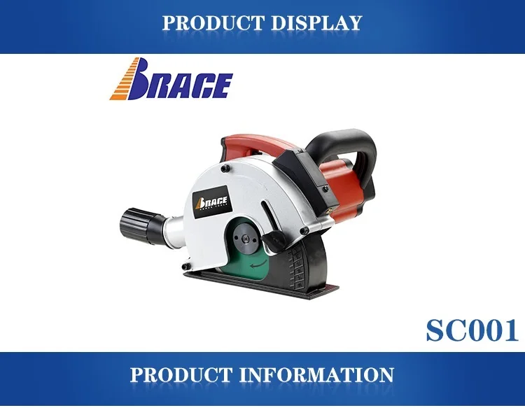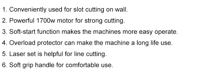 Features | 1. Conveniently used for slot cutting on the wall 2. Soft-start function makes the machine more easy operate(optional). 3. Over loaded protector can make the machine a long life use(optional). 4. Laser set is helpful for line cutting(optional) |