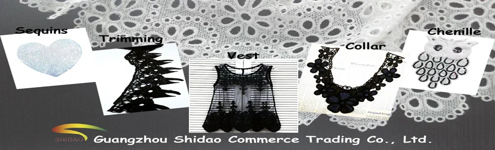 Our products have been sold all over the world and enjoy a good reputation,we can offer you a series of computer embroidefy lace,such as Lace Fabric, Lace Trimming ,Embroidered Badges, LaceVest Garment ,Lace Collar and some other products.We are looking for you coming!