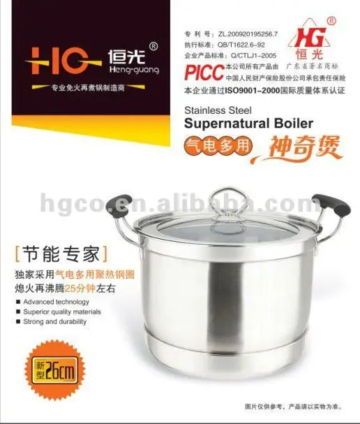 2.The base of the inner pot is use of high tech heat absorbing steel coil.It can fast in absorbing heat and slow in releasing it.It is able to continue boiling for more than 25 minutes after fire is turned off.The inner pot can keep 1 hour ebullition until the food is cooked and will go into the heat preservation condition.Use this pot to cook any kind of food,generally needs 10 minutes,and extremely saves the energy.
