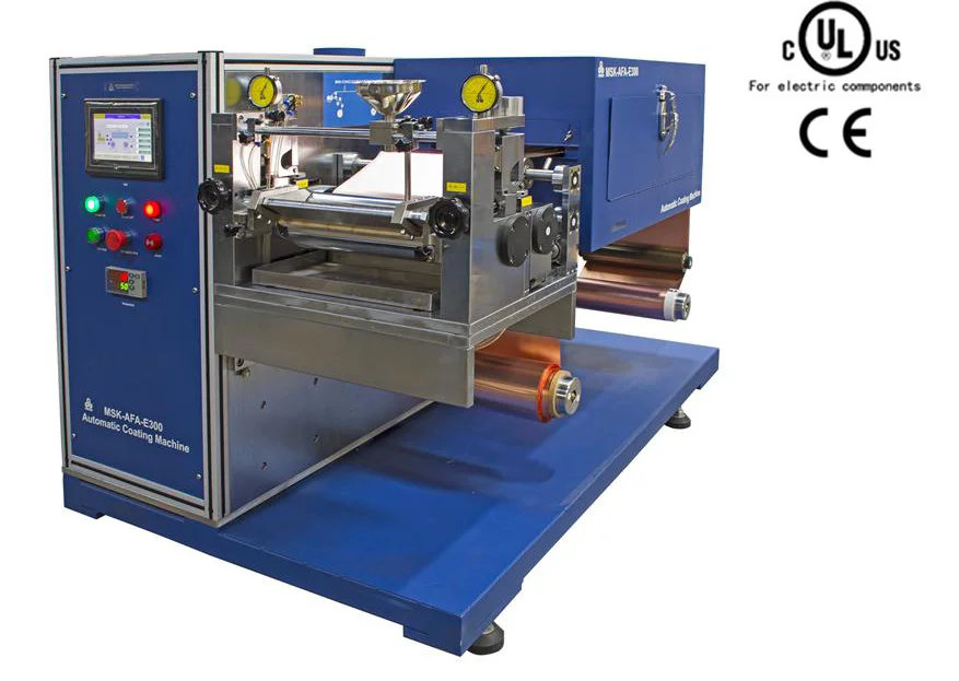 MSK-AFA-E300-UL is a CE Certified and UL inspection ready automatic battery electrode coating system with a compact footprint that is less than 6'x3'. It is perfect for research or building prototypes (e.g. pilot scale studies) of new generation rechargeable batteries. It is integrated with the functions/ features of metallic foil roll unwinding (reeling out), slurry feeder, coating blade, baking oven, and final electrode winding (reeling in) together with touch screen operation for customer's utmost convenience.