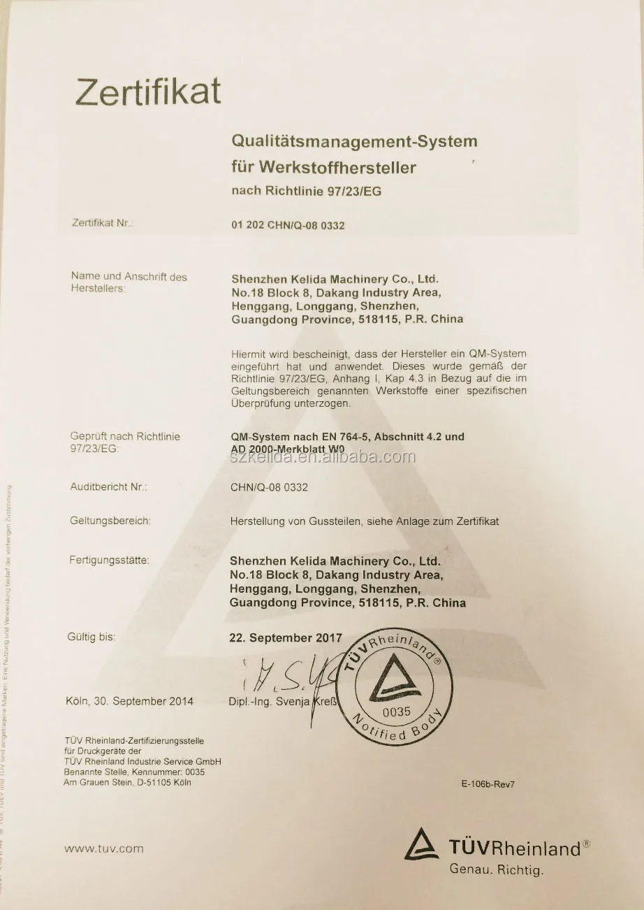 We got the main certification for European market(PED from TUV Germany)