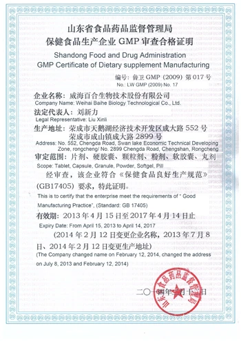| Baihe Biology Technological Co., Ltd., the largest manufacturing base of nutrional supplements in Asia, has nearly 20 years' experience in the production of nutritional supplements, all the seven production plants have passed sever international quality and management certifications, with dozens of imported soft capsules, tablet and hard capsule production lines and affilicated equipments. | ![]() |