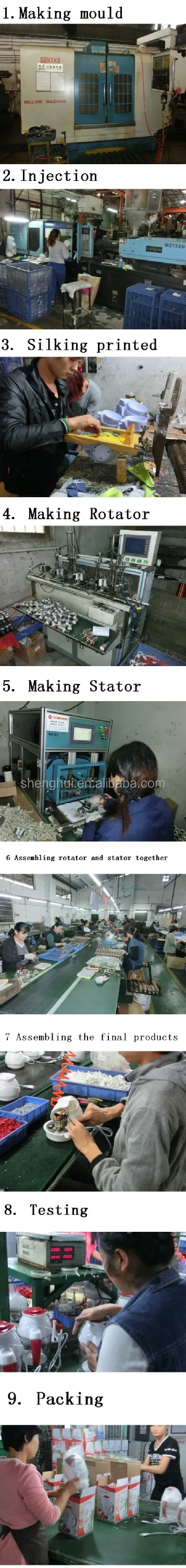 Jiangmen Jianghai District Shenghui Electric Co., Ltd. integrates mould development, plastic injection, motor production and assembly. We specialize in manufacturing all kinds of electric home appliances, electric heating products and so on. All the products are sold to Europe, and Middle East. Many products were passed CE, GS certification, and RoHS approval. We have obtained ISO9001 Certificate. Our products are checked according to the standards of IQNET and CQC.