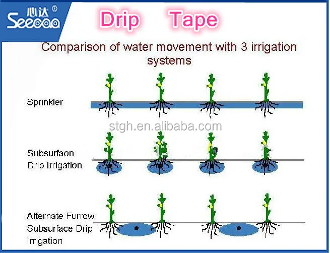 Drip Irrigation: know as trickle irrigation, where water is slowly applied through small emitter openings to soil surface. It can be applied in crop fields, greenhouses, and landscaping. Now many farmers have used the drip irrigation system to irrigation crops or plants, such as: corn, cotton, water melon, vegetable, potatoes, peppers, bananas, tomatoes, lettuce, grapes, orchards, flowers etc.