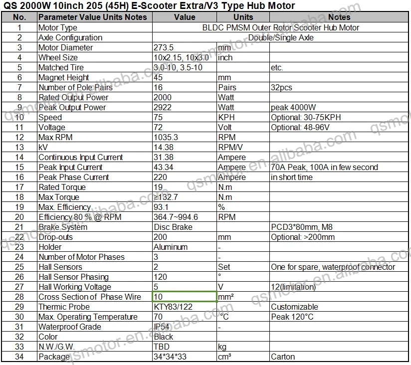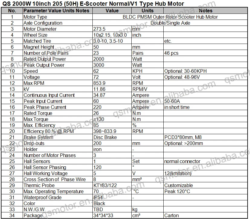 QS 10inch 2000W 205 (50H) E-Scooter V1 Type Hub Motor