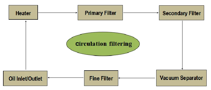We adopt the double mesh type impurity removal method, firstly remove all the impurities containing impurities with particle size ≥5μm or more in the oil through the filter filter; then use the molecular adsorption material (HDM) imported from Germany to make the FH filter with ≤5μm impurities. By removing the impurities of 1-5 μm in the oil by adsorption, the cleanliness of the oil is guaranteed to reach NSA level 6.