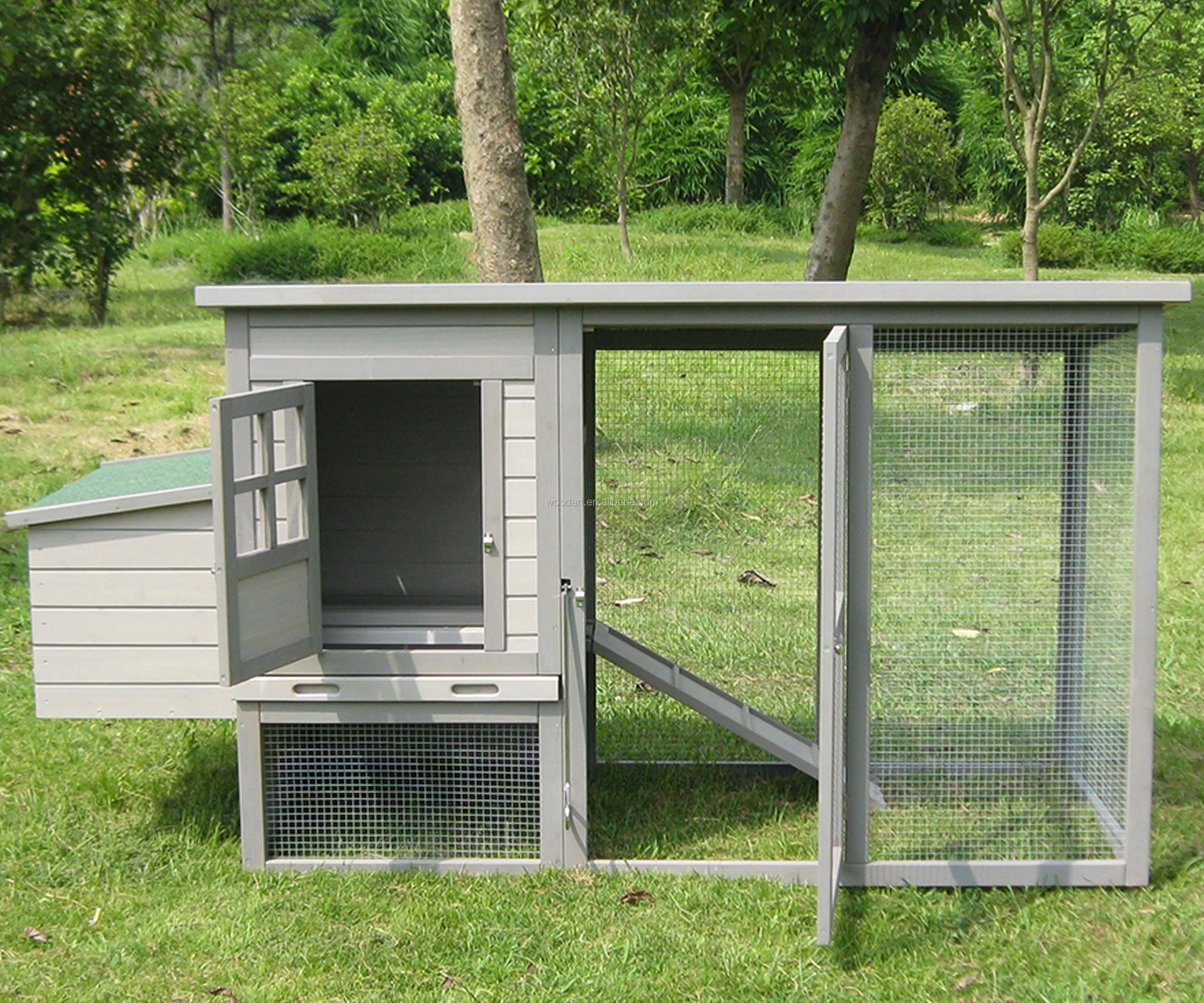 Feature: | • Large room with integrated run offers your pets comfortable life. • Living area off the ground, which stops vermin from nesting underneath the coop. • With a pull out tray for easy cleaning and keep your pets dry. • External handle makes shutting the door easy and convenient. • Waterproof and UV prood asphalt roof. • 100% nontoxic stained. • Easy assembly included of instructions. |