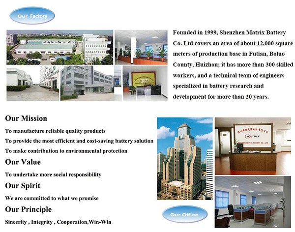 Shenzhen Matrix Battery Co., Ltd. (MATRIX BATTERY for short) is a high-tech manufacturer specialized in the research, production, sale and service of all kinds of Matrix (brand) lead acid batteries. Our company is committed to studying and applying new materials in green energy field and making it industrialized. We mainly have four series of products, which are lead acid battery series for backup power, lead acid battery series for motorcycle, powerful lead acid battery series and stored energy lead acid battery series. The productive capacity of MATRIX BATTERY can reach 1 million Kilovolt Ampere/Hour per year with more than 600 staff members and advanced battery production technology and ability.