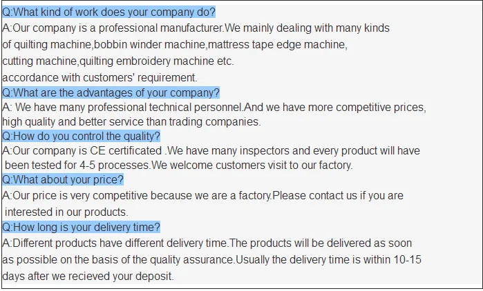 Technical data: Sewing head woek elevation: 25°65° Convey speed of work tabe belt:0.14m/min Available mattress thickness: 100-400mm Production effciency:16-20units/hour Motor power: 3 KW Air pressure:0.6-0.8Mpa Work table size: 3750LX1980WX mm