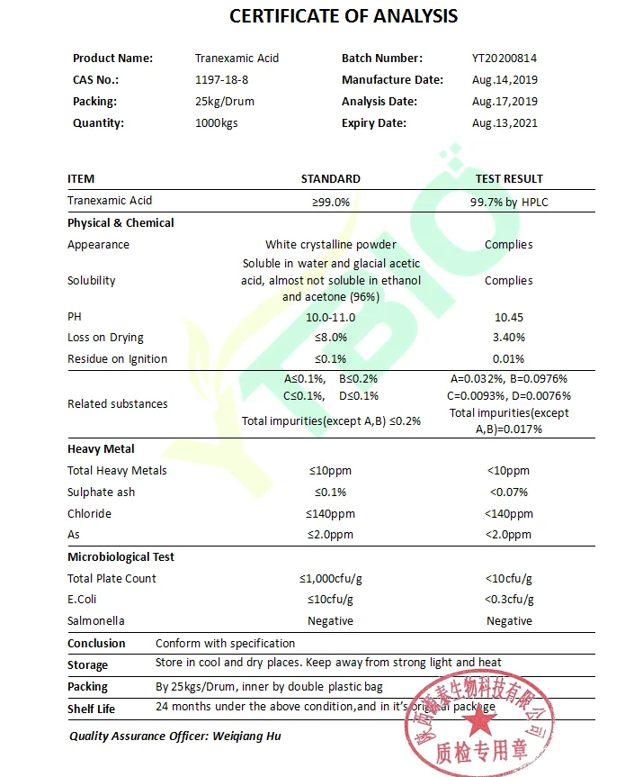 Whitening effect Clinical studies for years have proved that tranexamic acid can dilute spot effectively and rapidly, which helps to demonstrate a perfect white and bright skin. The spot-removing effect of tranexamic acid is about 50 times over Vitamin C, and 10 times over AHA. The concentration limit of usage is 2%-3%, and in cosmetics the amount is around 0.5%. |