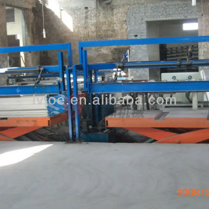 Raw material is transported and lifted to feeding hopper, after measurement it comes to vertical mixer. Face and back paperboard are lifted to each shelf. They are tensioned with special tension unit. Mixed material from vertical mixer falls down to back paperboard, then formed into shape and covered with face paperboard, after last flattening the semi finished plasterboard is completed.