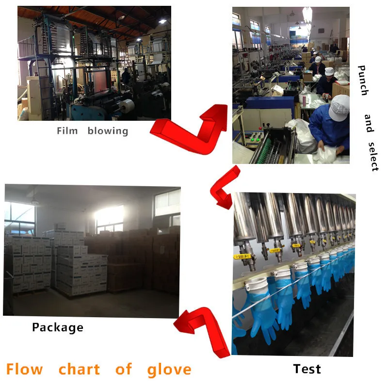 Our factory mainly produce standard HDPE/LDPE/CPE/TPE/EVA gloves ,PE/PVC apron&PE Haircut cape, CPE protective isolation gown,Ziplock bags for package with CE ISO ROHS certifications.