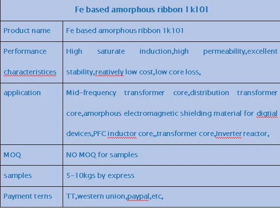 The product is mainly used to replace silicon steel sheet and used in many ways, such as: different power of frequency distribution transformers, power factor correction inductors, small transformers, high-power rectangular iron core, the output energy storage filter inductors, saturable reactor, anti-jamming filter inductorand IF transformer iron core. The working frequency range of the product is from 50Hz to 10kHz. When it is used as the iron core materials of a high-power switching power reactor , the using frequencies of the product can be up to 50kHz.